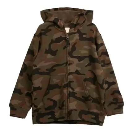 Camouflage Zipper Hoodie This Hoodie made of sweatshirt with camouflage fleece interior. The model has long sleeves, collar with hood,